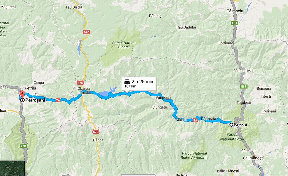 DN 7A. Brezoi (Vâlcea) – Petroșani (Hunedoara). Conduceți pe malul lacurilor Brădișor și Vidra, printre cheile cu pereți de stâncă și treceți prin stațiunea Voineasa.