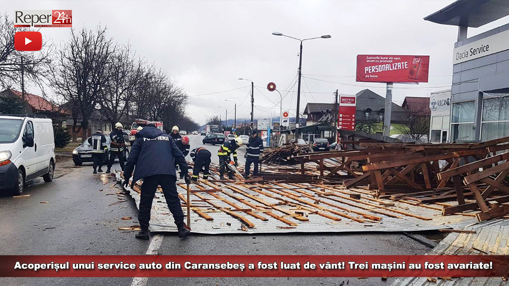 „În jurul orei 12:10, un echipaj de pompieri cu o autospecială din cadrul Detașamentului de Pompieri Caransebeș, a intervenit de urgență la un eveniment de cădere a unui acoperiș al unui service auto, care a căzut peste trei autoturisme”, explică Adrian Manofu, purtătorul de cuvânt al Inspectoratului pentru Situații de Urgență Semenic al județului Caraș-Severin.