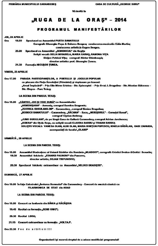 Mâine, 25 aprilie 2014, începând cu ora 17.00, va avea loc o paradă a participanților, a portului și jocului popular, cu plecare din fața Primăriei, pe traseul „Arcul Împăcării” (între Catedrala ortodoxă „Învierea Domnului” și Biserica romano-catolică) – Str. Episcopiei – Piaţa General Ioan Dragalina – Str. Nicolae Bălcescu – Str. Cloşca – Parcul Teiuş, după care, sub genericul „Cântec, joc și voie bună” vor evolua mai multe formații de dansuri din zona Caransebeșului, cum ar fi „Armenișana” din Armeniş, „Zestrea Gugulanilor” din Caransebeș, „Bobocii Banatului” din Caransebeș, „Săcana” din Sacu și „Merișorul” din Cornuțel Banat, dar și ansamblurile „Junii Gugulani” de pe lângă Casa de Cultură Caransebeş, „Iedera” din Oțelu Roșu cu soliștii vocali Claudia Barbu și Traian Barbu. De asemenea, pe scena din Parcul Teiuș vor mai urca soliștii vocali Vanesa Olan, Alin Olan, Maria Borțun-Popescu, Ionela Bădălan și Gabi Zaharia acompaniaţi de formația „Olanii”.