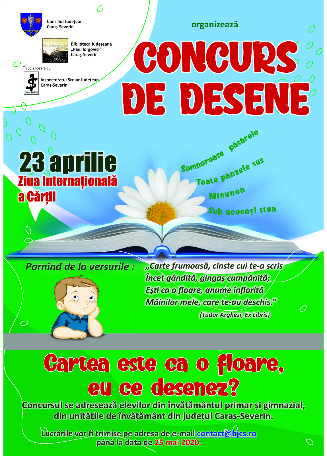 Biblioteca Județeană „Paul Iorgovici” Caraș-Severin provoacă elevii cărășeni să își folosească imaginația și creativitatea, în cadrul unui concurs de desene, pornind de la versurile poetului Tudor Arghezi. Concursul este lansat chiar de ziua internațională a cărții și a dreptului de autor, marcată anual pe data de 23 aprilie, concomitent cu ziua bibliotecarului din România.