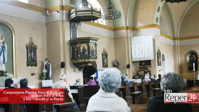 Într-o frumoasă şi caldă atmosferă, Biserica Romano-Catolică „Maria Zăpezii“ din Reşiţa a găzduit duminică, 27 aprilie, începând cu orele 10.00, cu prilejul canonizării Papilor Ioan al XXIII-lea şi Ioan Paul al II-lea, o Sfânta Liturghie duminicală în limbile română, germană şi maghiară. Biserica a fost plină la slujba celebrată de părintele Janos Varga. Acesta a predicat în omilie despre duminica milostivirii divine, o sărbătoare post-pascală (se celebrează în cadrul bisericii catolice universală la propunerea Papei Ioan Paul al II-lea, în a doua duminică după Sărbătoarea Învierii Domnului), ne-a precizat preşedintele Forumului Democratic al Germanilor din Caraş-Severin, Erwin Josef Ţigla. După Sfânta Liturghie, în biserică a fost realizată, prin intermediul internetului, preluarea ceremoniei de canonizare a Papilor Ioan al XXIII-lea şi Ioan Paul al II-lea, organizată în piaţa Sfântul Petru din Roma, în prezenţa actualui suveran pontif, Papa Francisc, şi a Papei emerit Benedict al XVI-lea.
