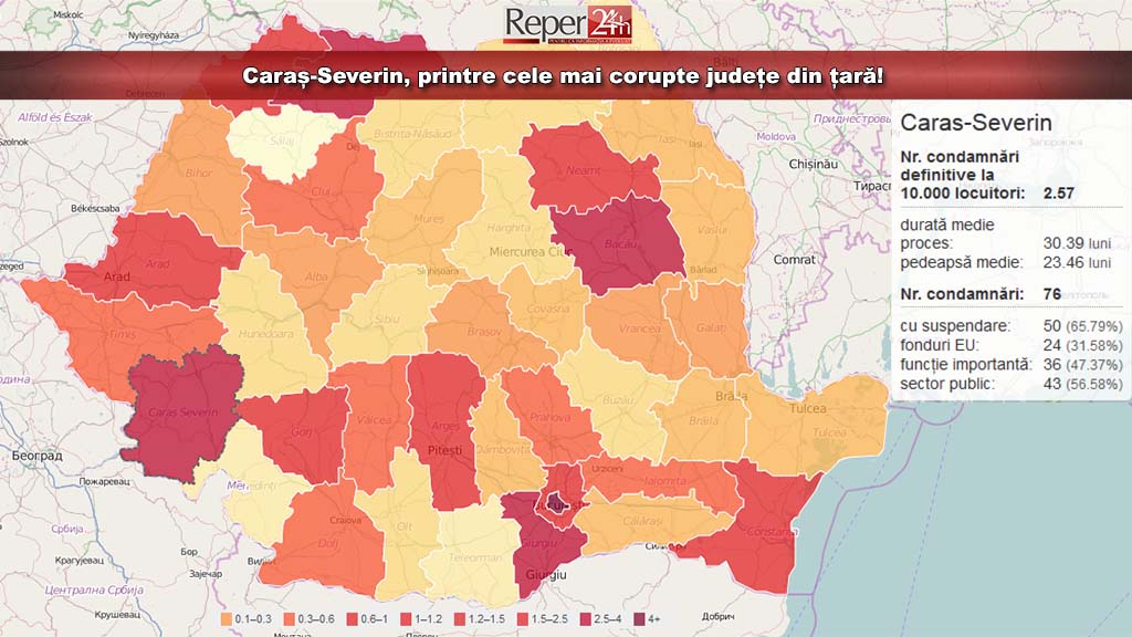 La nivelul județului Caraș-Severin, în perioada 2010-2014, au fost finalizate 76 de procese, 65,79% dintre sentințe fiind condamnări cu suspendare, se arată în această analiză. În 31,58% dintre cazuri au fost implicate fonduri europene, în 56,58% dintre cazuri condamnații lucrau în sectorul public, iar 47,37% dintre aceștia aveau funcții de conducere.
