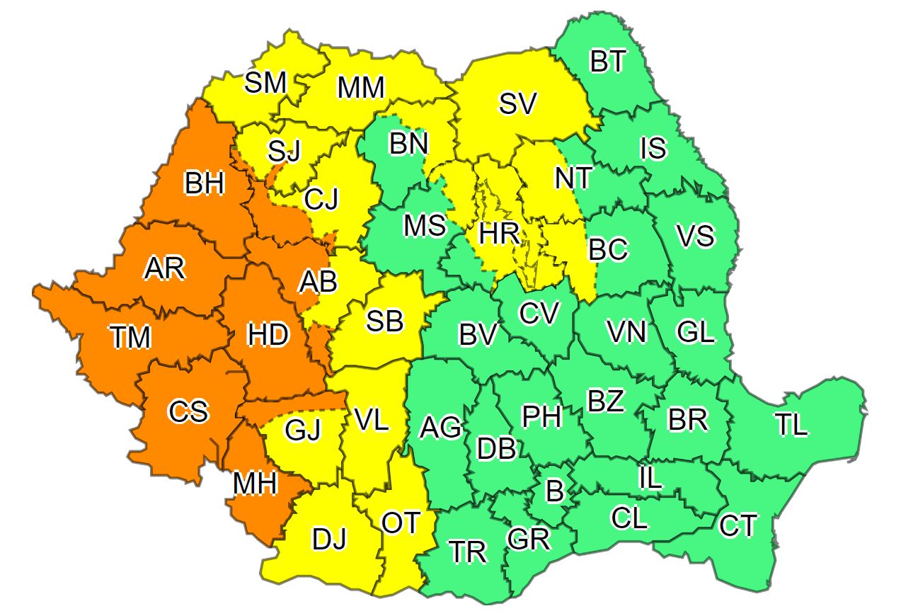 De la ora 18:00 până miercuri la ora 13:00, județul Caraș-Severin intră sub cod portocaliu. Conform meteorologilor, în Banat, Crișana, vestul Transilvaniei și al Olteniei, vor fi averse torențiale, descărcări electrice, vijelii și grindină. Cantitățile de apă vor depăși 30…40 l/mp și, pe arii restrânse, 50…70 l/mp.