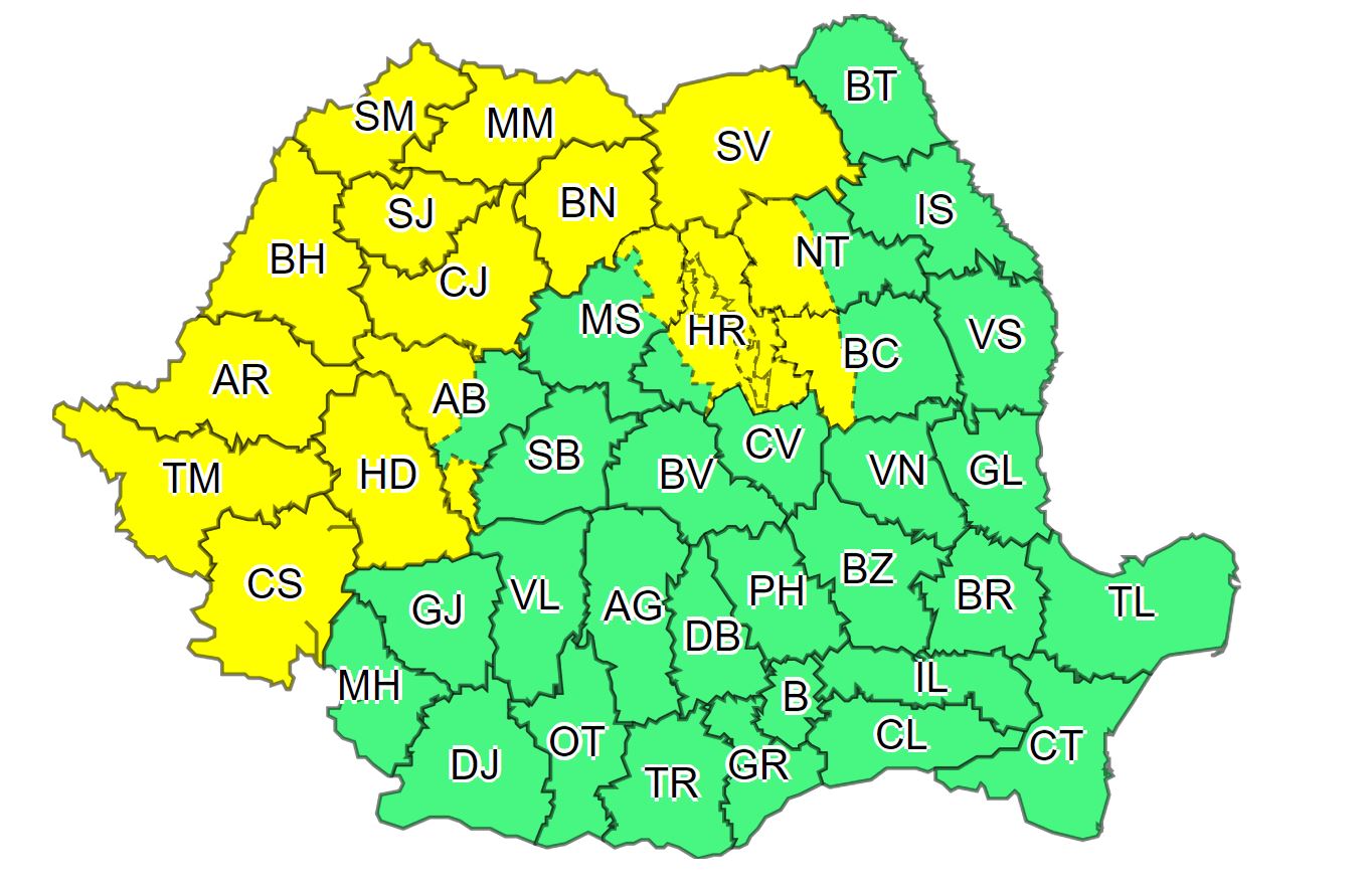 „În intervalul menționat, în Banat, Crișana, Maramureș, local în Transilvania și vestul Moldovei, vor fi perioade cu instabilitate atmosferică accentuată ce se va manifesta prin averse ce vor avea și caracter torențial, descărcări electrice, intensificări de scurtă durată ale vântului, vijelii și grindină. Cantitățile de apă vor depăși 25 l/mp și izolat 30…40 l/mp”, transmit meteorologii.