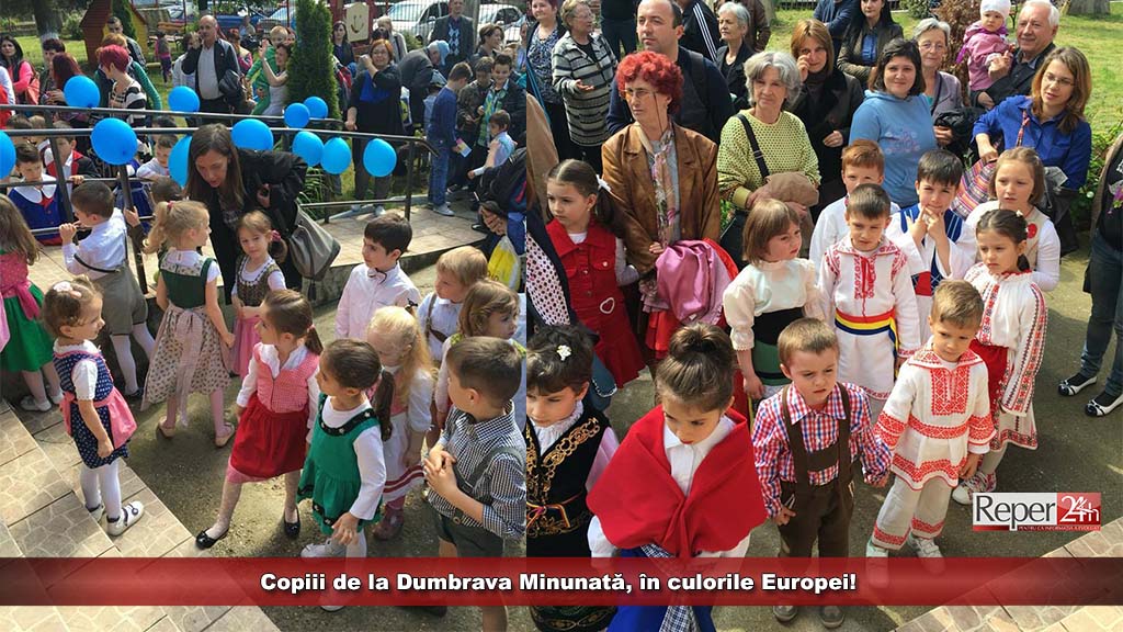 Copii de la Grădinița cu Program Prelungit „Dumbrava Minunată“ Reșița, au sărbătorit bătrânul continent printr-o serie de manifestări cultural-artistice reunite sub titlul „Colorăm Europa“. Baloane albastre, panouri cu desene în culori vii, zarvă, cântece și dansuri, toate într-o mișcare mai mult sau mai puțin coregrafiată care s-a petrecut sub privirile unor părinți și bunici emoționați la oferta artistică a micuților, aceeași care își petrec diminețile și după-amiezile în instituția educațională din microraionul 2 al orașului Reșița.