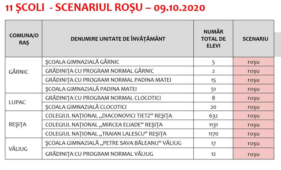 Din cele 409 unități de învățământ din județ, 270 își desfășoară cursurile în scenariul verde, 128 – în scenariul galben (creștere datorată ratei de incidență de peste 2/1000 locuitori în municipiul Reșița), iar 11 – în scenariul roșu.