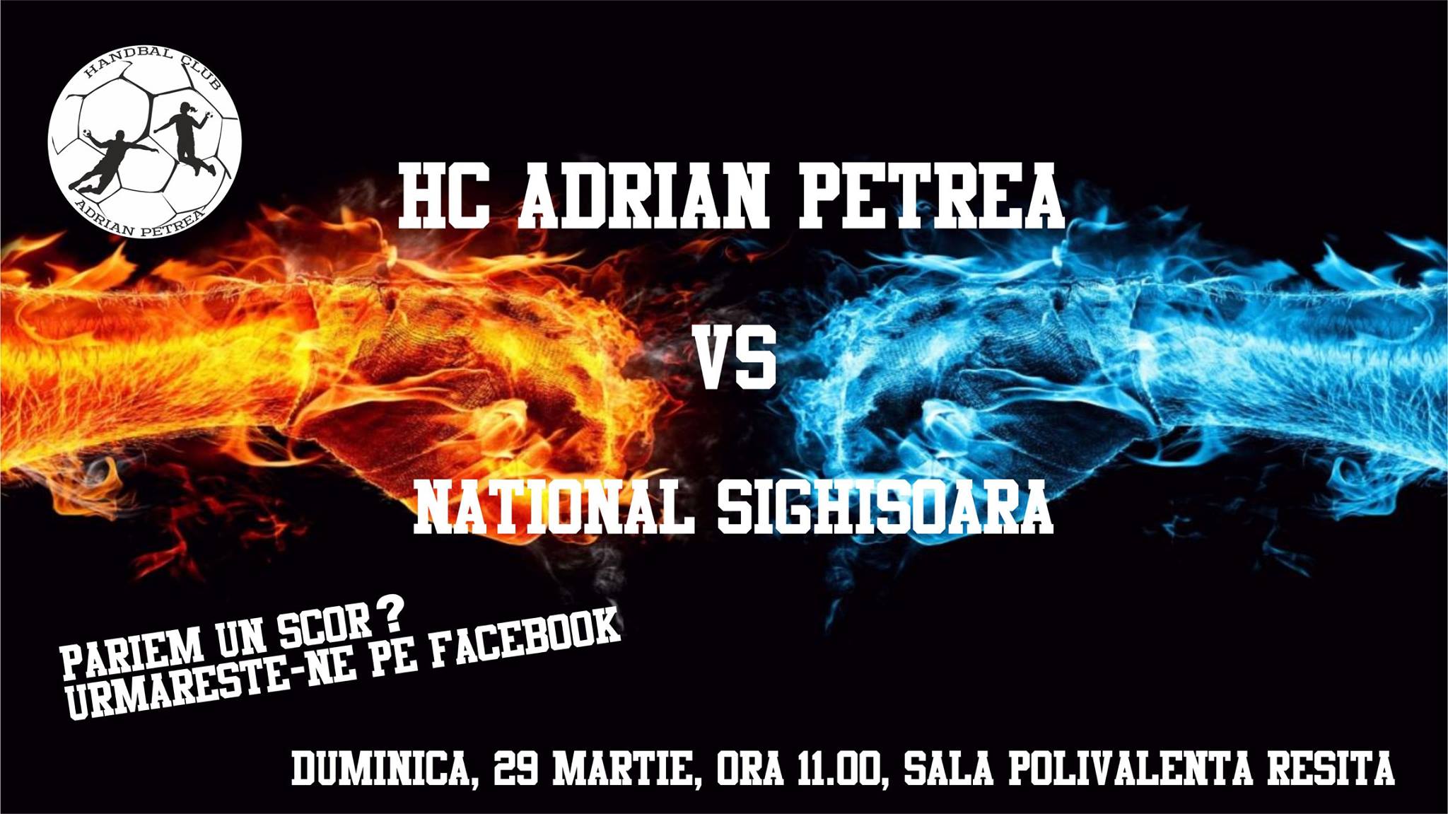 Următorul joc în fața propriilor suporteri va avea loc duminică, 29.03.2015, în cadrul etapei a XXI-a, sparring partner pentru HC Adrian Petrea fiind de această dată Național Sighișoara. Meciul se va disputa începând cu ora 11:00 la Sala Polivalentă din Reșița.
