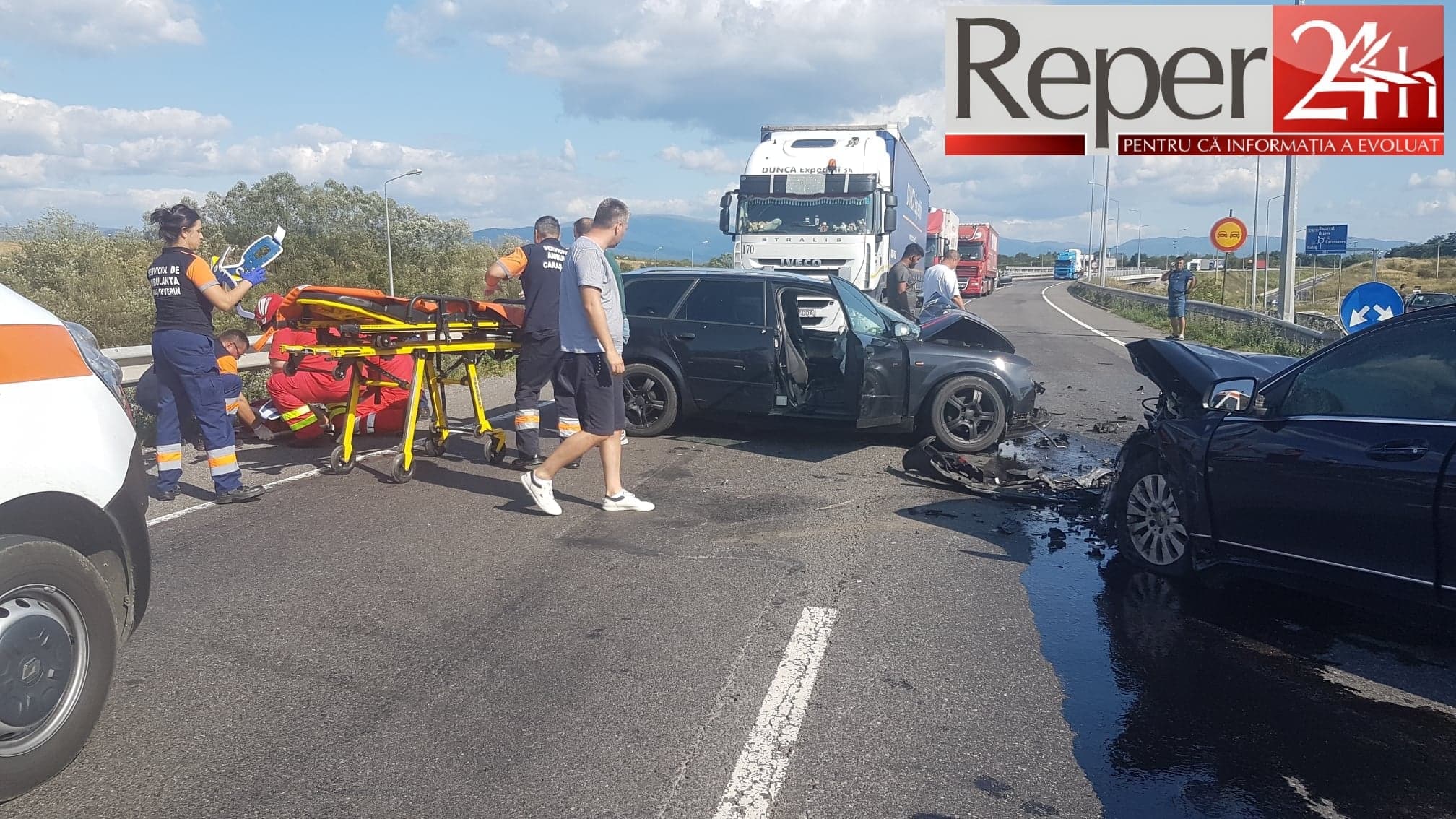 Toate cele patru victime, cei doi conducători auto și doi pasageri, au fost transportați la Spitalul Municipal din Caransebeș.