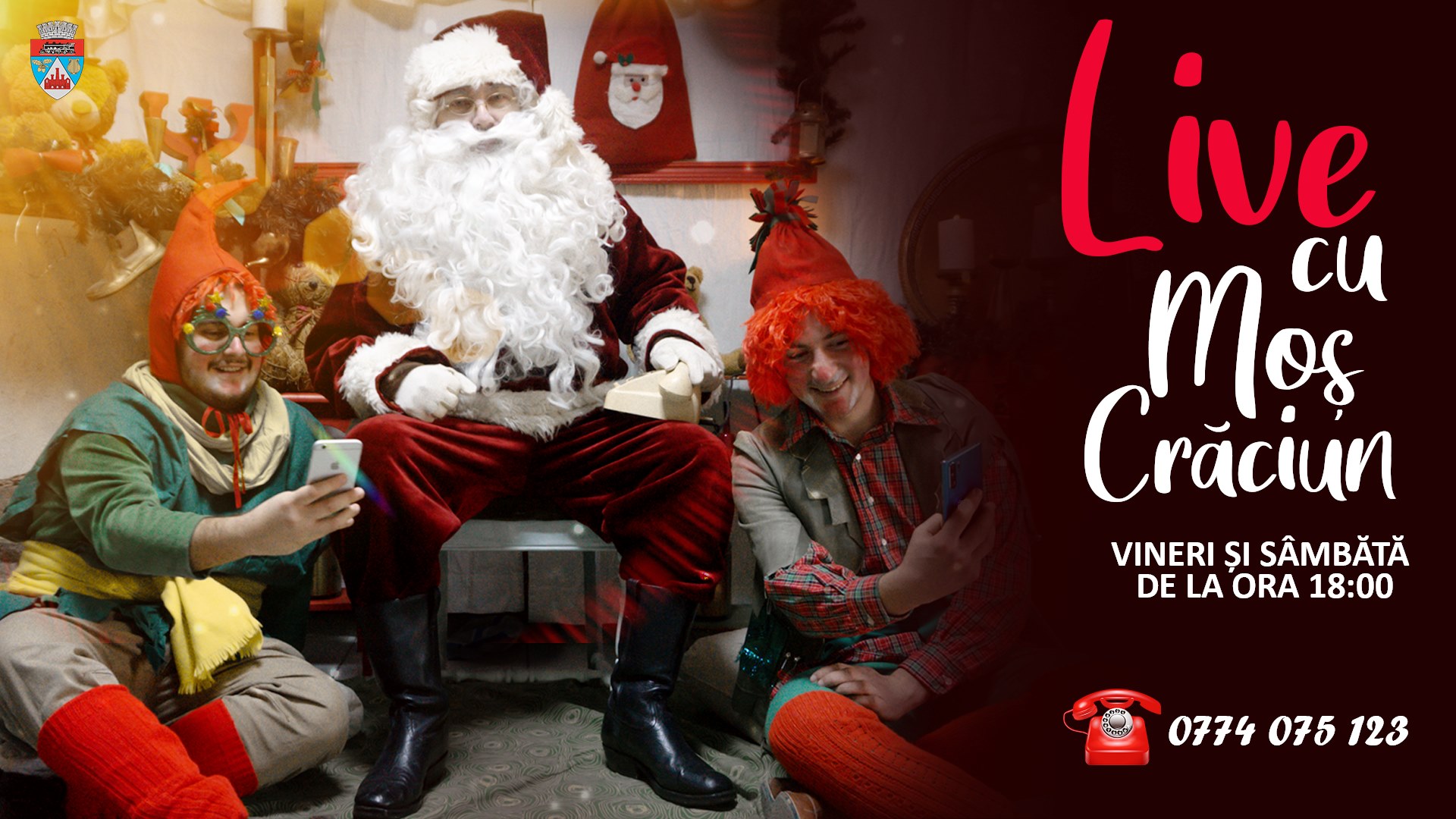 Așadar, în fiecare vineri și sâmbătă, de la ora 18:00, timp de două ore, Moșul va fi LIVE pe pagina de Facebook a Primăriei.