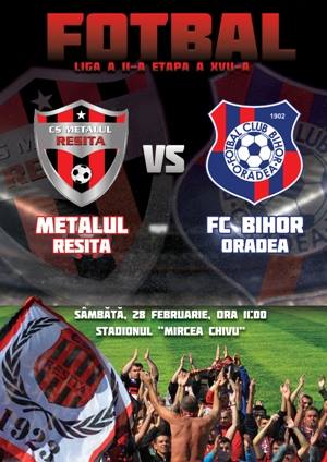 Metalul Reșița întâlnește în primul meci oficial din 2015 pe FC Bihor Oradea, sâmbătă, 28 februarie, de la ora 11:00, pe stadionul Mircea Chivu din Valea Domanului.