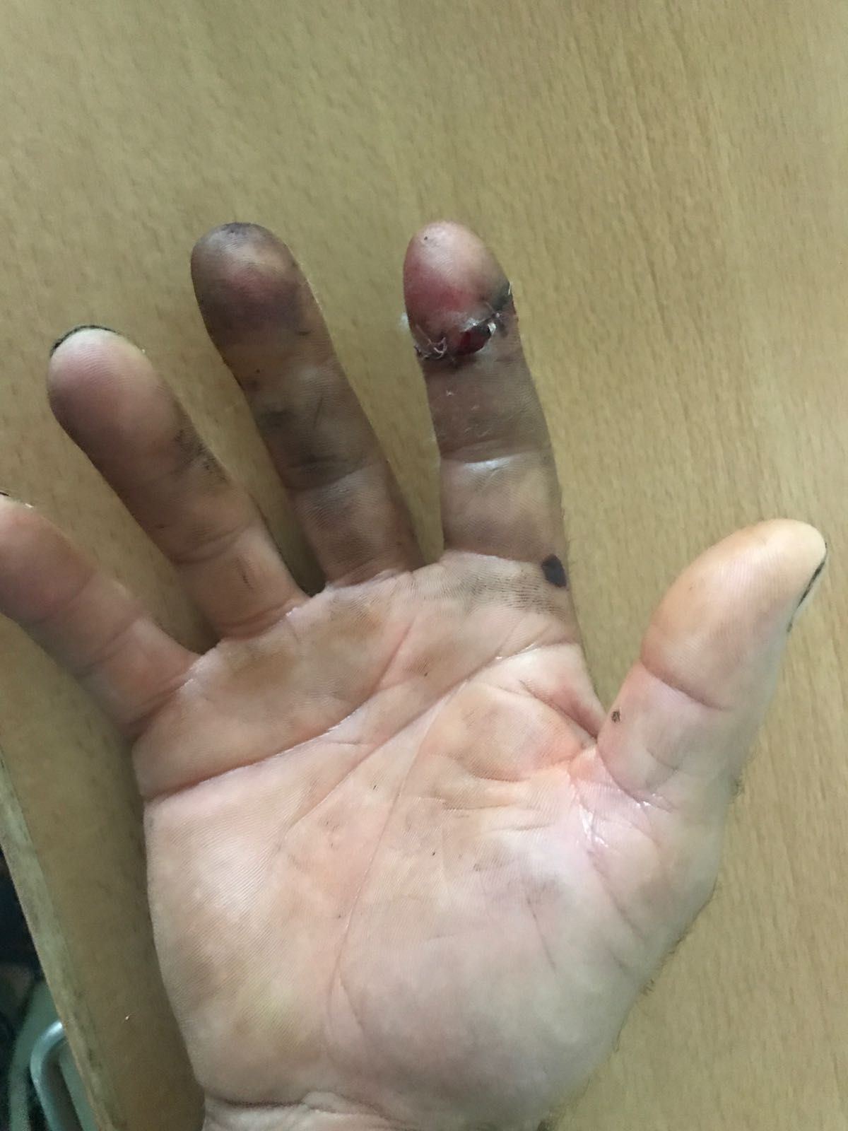 Când s-a prezentat la unitatea medicală, pacientul respectiv, în vârstă de 47 de ani, avea falanga 3 a degetului arătător de la mâna dreaptă aproape retezată, aceasta atârnând într-o bucată de piele, fiind secţionate atât vasele de sânge, cât şi structura osoasă.