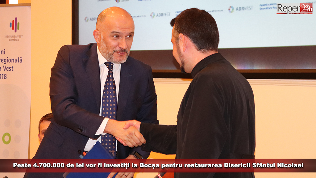 Peste 4.700.000 de lei, bani proveniți din fonduri europene vor fi investiți la Bocșa pentru restaurarea, conservarea şi valorificarea Bisericii Ortodoxe cu hramul „Sfântul Nicolae”. Contractul de finanțare a fost semnat ieri de Silviu Ionel Ferciug, preot paroh şi reprezentant legal al Parohiei Ortodoxe Române Bocşa şi directorul general al Agenției pentru Dezvoltare Regională Vest, Sorin Maxim.