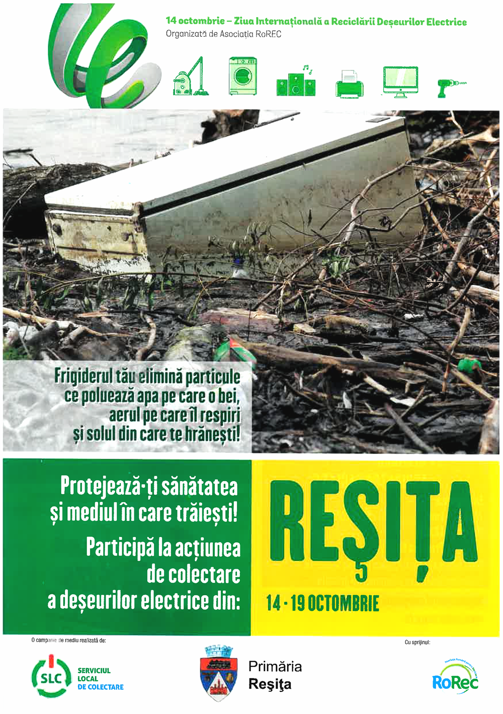 Primăria Municipiului Reşiţa în colaborare cu Serviciul Local de Colectare – partener – Asociaţia Română pentru Reciclare RoRec organizează în perioada 14 -19 octombrie o nouă campanie de colectare a DEEE –urilor în municipiul Reșița. De mâine va fi funcționa o linie telefonică de call-center pentru programarea și ridicarea deșeurilor de la domiciliu, urmând ca sâmbătă, 19 octombrie să fie deschise mai multe puncte provizorii de colectare. Pentru a-i motiva pe cetățeni să participe la campanie, organizatorii pun la bătaie mai multe premii, care fi vor fi atribuite în urma unei tombole.
