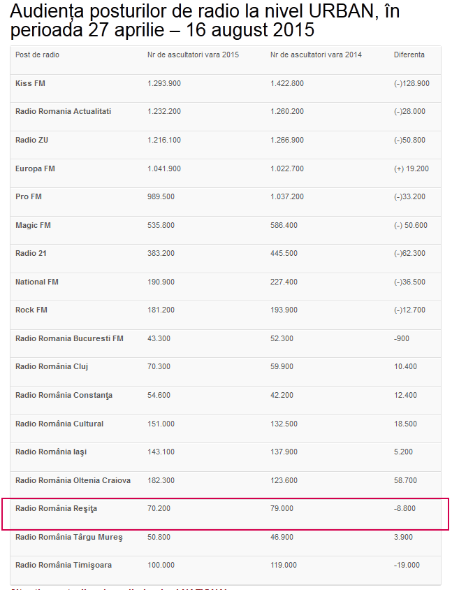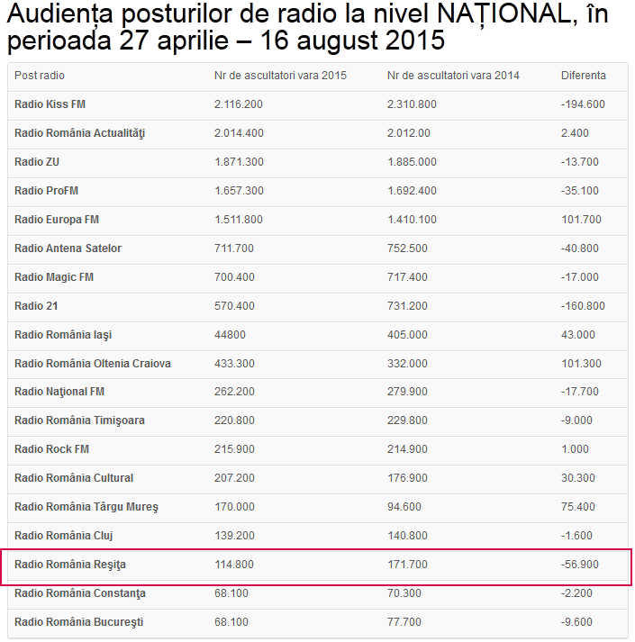 - 57 de mii de ascultători! Atât a pierdut la nivel naţional Radio Reşiţa, din vara lui 2014 şi până în vara lui 2015!!