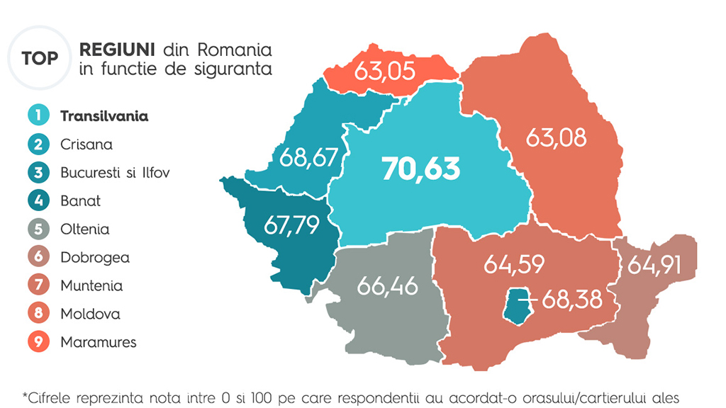 La nivel de regiuni istorice, Transilvania a primit cel mai bun scor de siguranță, fiind urmată de Crișana, București-Ilfov și Banat. La polul opus, Maramureș și Moldova au obținut cel mai mic punctaj, fiind evaluate ca fiind cele mai nesigure regiuni din țară.