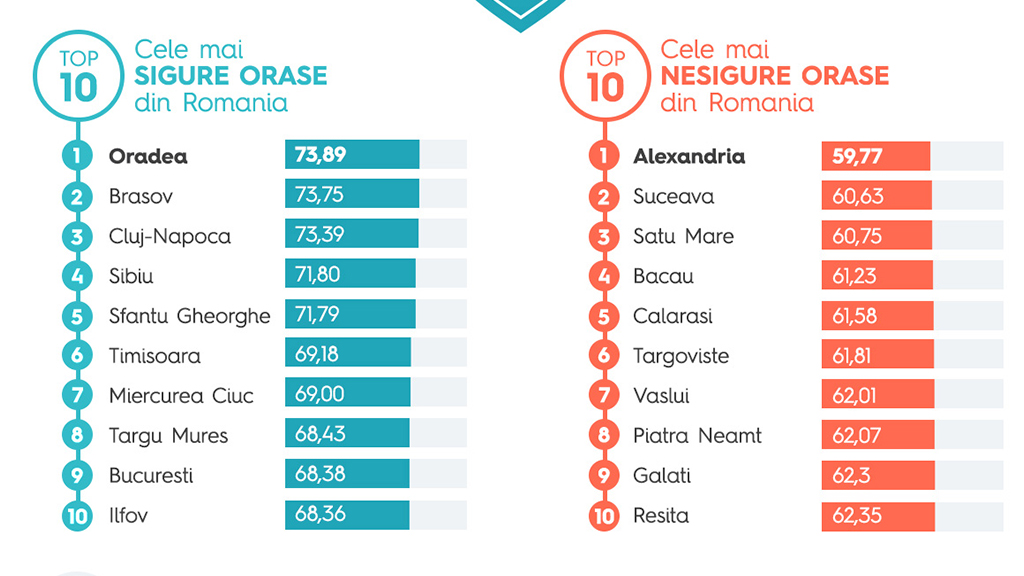 La cercetarea storia.ro au participat 93.532 de români din întreaga țară, iar conform evaluărilor oferite de aceștia, în topul celor mai sigure orașe se mai situează: Brașov, Cluj, Sibiu, Sfântul Gheorghe și Timișoara. La polul opus, în cadrul orașelor considerate ca fiind cele mai puțin sigure, Reșița este întrecută doar de 9 localități: Galați, Piatra Neamț, Vaslui, Târgoviște, Călărași, Bacău, Satu Mare, Suceava și Alexandria.