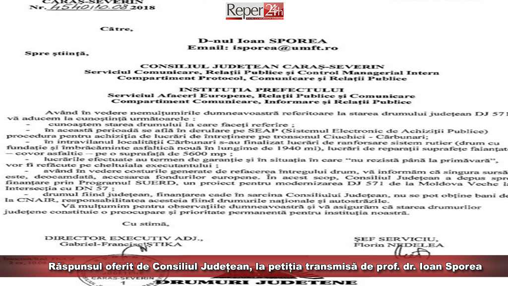 Dacă din partea prefectului Matei Lupu, medicul Sporea a primit un răspuns formal cu privire la înregistrarea și soluționarea petiției cu numărul 12057/30.07.2018, pe românește, apă sfințită pe fruntea muribundului, Consiliul Județean Caraș-Severin, prin vocea Directorului Executiv al Direcției de Drumuri Județene Caraș-Severin, Gabriel Știka, vine cu precizări legate de drumul județean vizat.