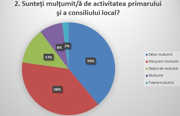 În ceea ce privește activitatea primarului și a Consiliului Local, 31 la sută dintre cei chestionați s-au declarat mulțumiți, 11 la sută foarte mulțumiți, 22 la sută destul de mulțumiți și doar 26 la sută au zis că sunt mai puțin mulțumiți, iar 10 la sută că nu sunt deloc mulțumiți.