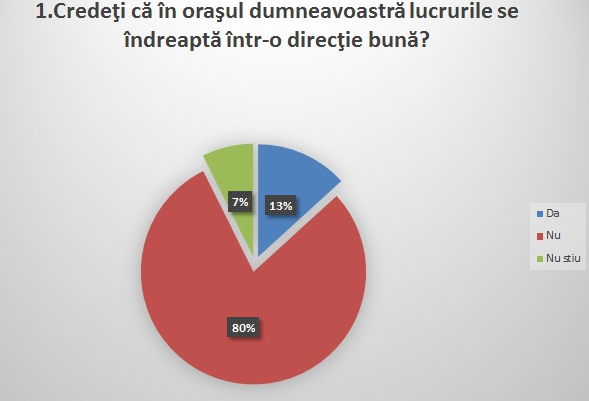 Ancheta de opnie a presupus chestionarea unui anumit eșantion de populație din ambele orașe cu privire la modul în care autoritățile locale își fac treaba. Astfel, din cele 140 de reșițeni chestionați, 80 la sută s-au declarat nemulțumiți de direcția în care orașul merge. Doar 13 la sută au considerat că Reșița se îndreaptă într-o direcție bună, în timp ce 7 la sută au preferat să fie sceptici și să nu ofere niciun răspuns concret.