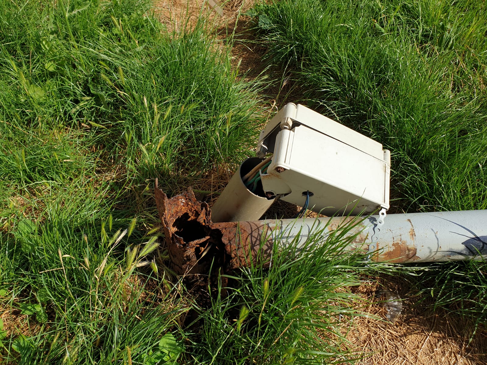Stâlp de iluminat pus la pământ la Reșița de vânt și rugină