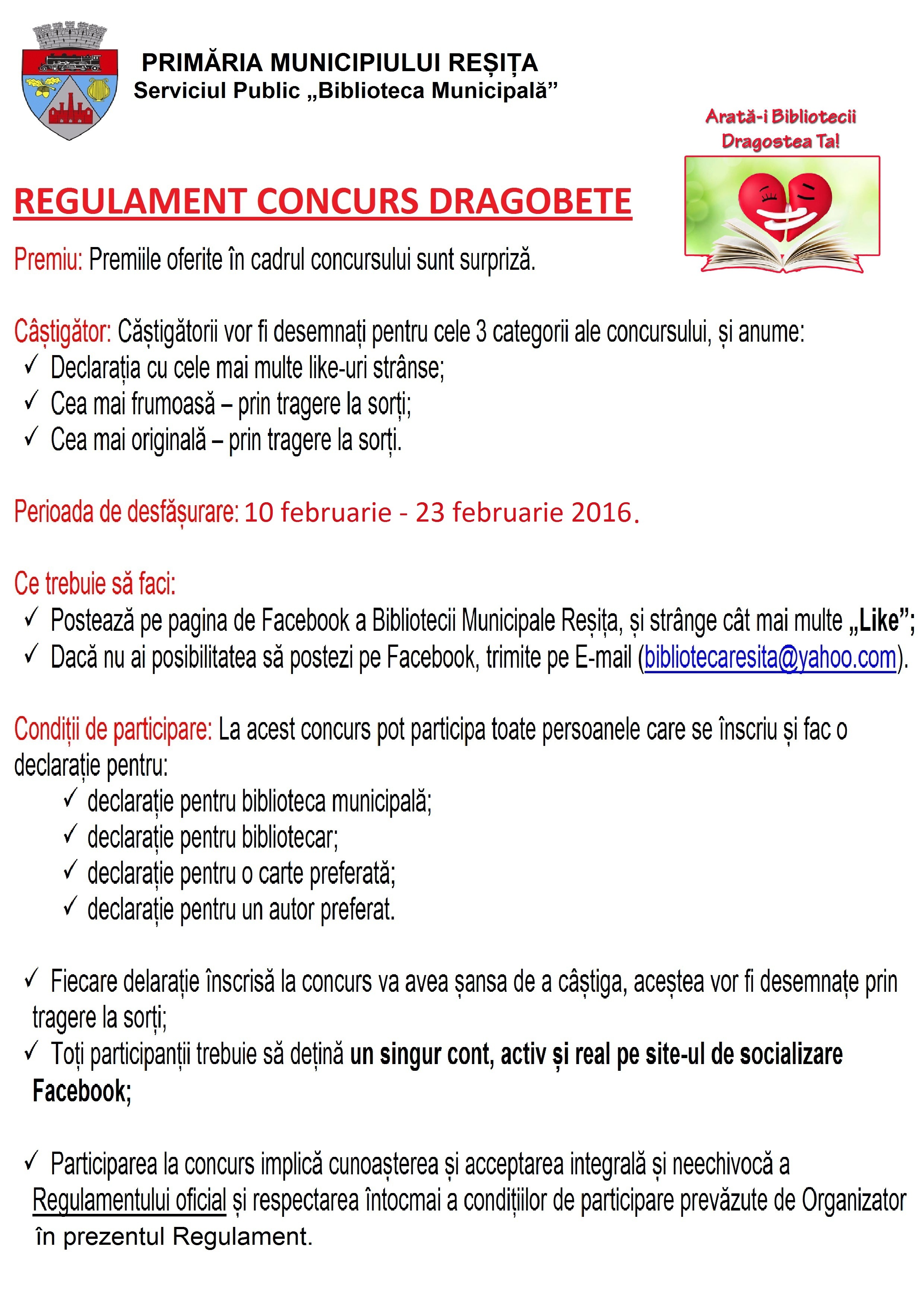 Declaraţiile de apreciere vor fi transmise în scris, până în la acea dată pe e-mail, la adresa resitabiblioteca@yahoo.com, sau pe Facebook –Biblioteca Municipală Reşiţa.