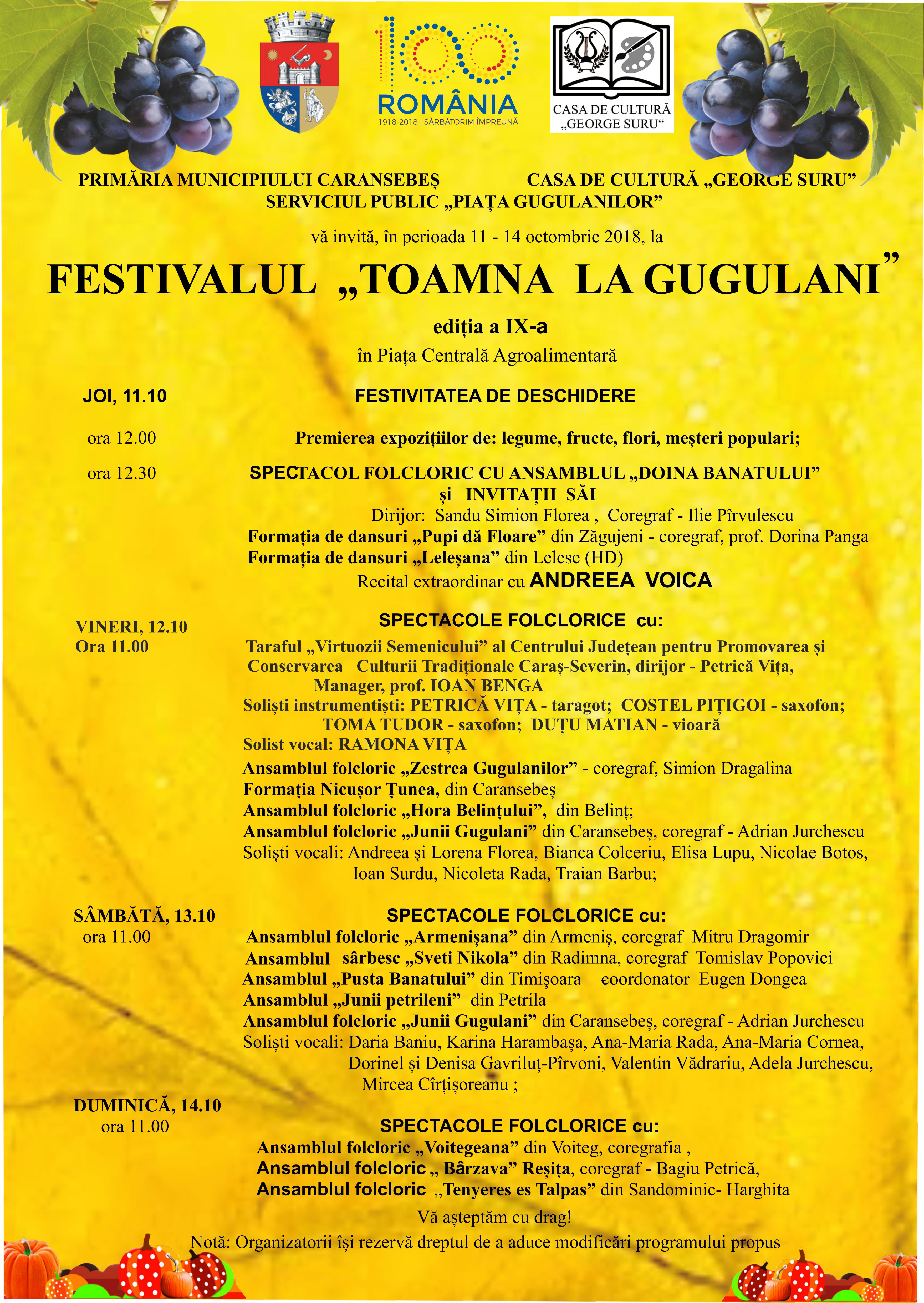 Organizatorii celei de-a IX-a ediții a festivalului „Toamna la gugulani” sunt Primăria municipiului Caransebeș, Casa de Cultură „George Suru și Serviciul public „Piața gugulanilor”.