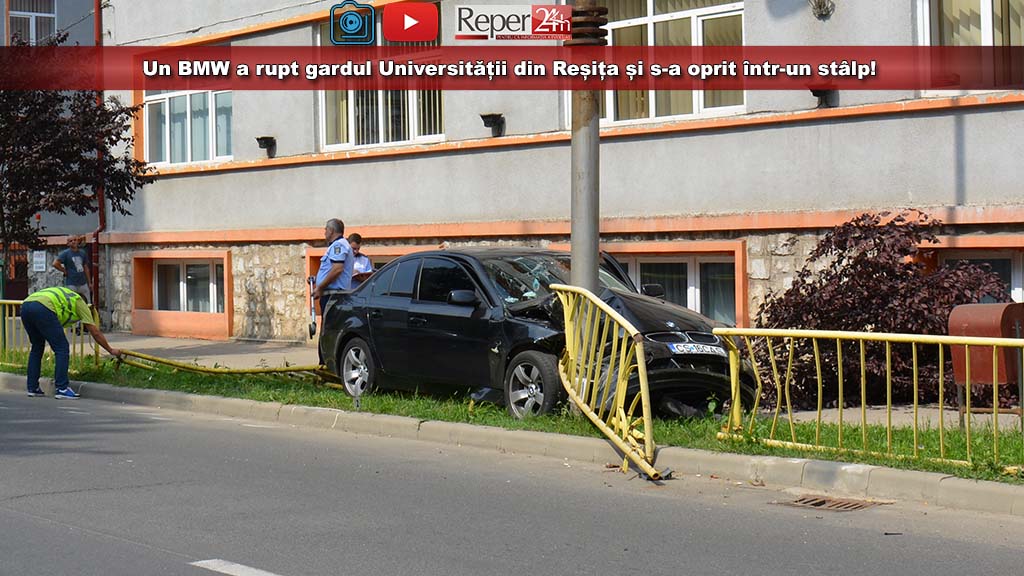 Un BMW a rupt gardul Universității din Reșița și s-a oprit într-un stâlp!